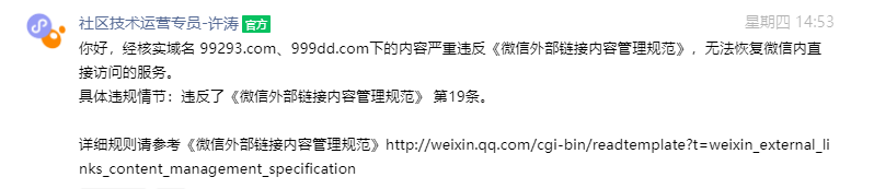 具体违规情节:违反了《微信外部链接内容管理规范》 第19条。