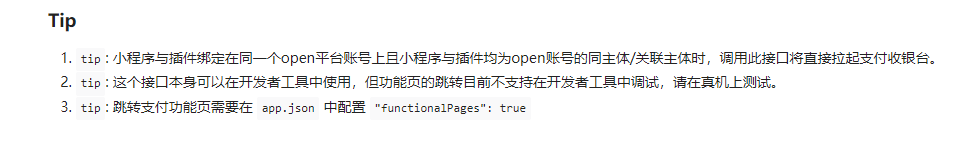 最近开发一个插件的需求,需要调用 requestPluginPayment付款,发现在安卓环境下调起微信收银台的时候会跳转到 “该功能无法使用,请返回使用该小程序其他功能” 的提示页,在苹果手机则没有问题可以正常付款。之后我把基础库升级到了2.32.3 ,在体验版中测试还是没有解决这个问题。