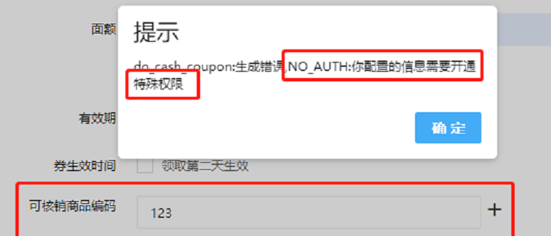 - 相关报错信息文案:"{"code":"NO_AUTH","message":"你配置的信息需要开通特殊权限"}"