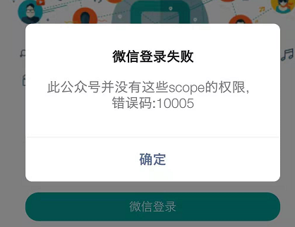 对于场景与帐号属性、能力项不对应时(如在移动端网页中使用网站应用的AppID调用登录能力),将会出现以下的错误提示:此帐号并没有这些scope的权限,错误码:10005