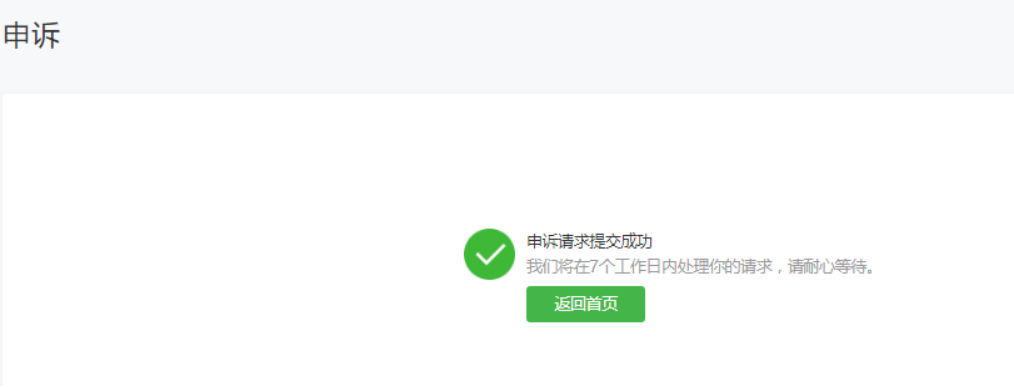 (1)完成申诉流程后,系统会提示“申诉请求提交成功”,平台将在7个工作日内处理,请耐心等待结果 。