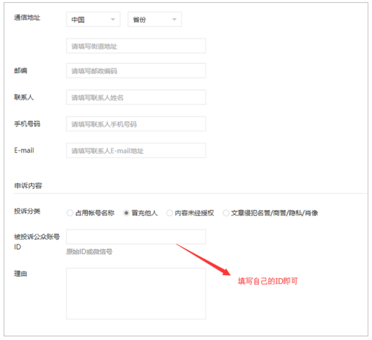 (1)进入申诉页面后,选择“冒充他人”,在被投诉公众号ID中填入你的ID,填写申诉理由,进行反通知投诉 。