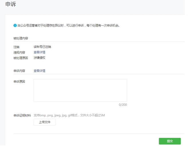 (1)点击“发起申诉”后,进入申诉页面,填写申诉理由,提交申诉证明材料;