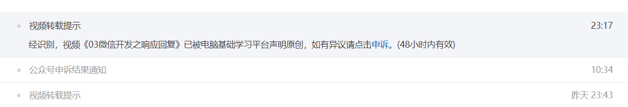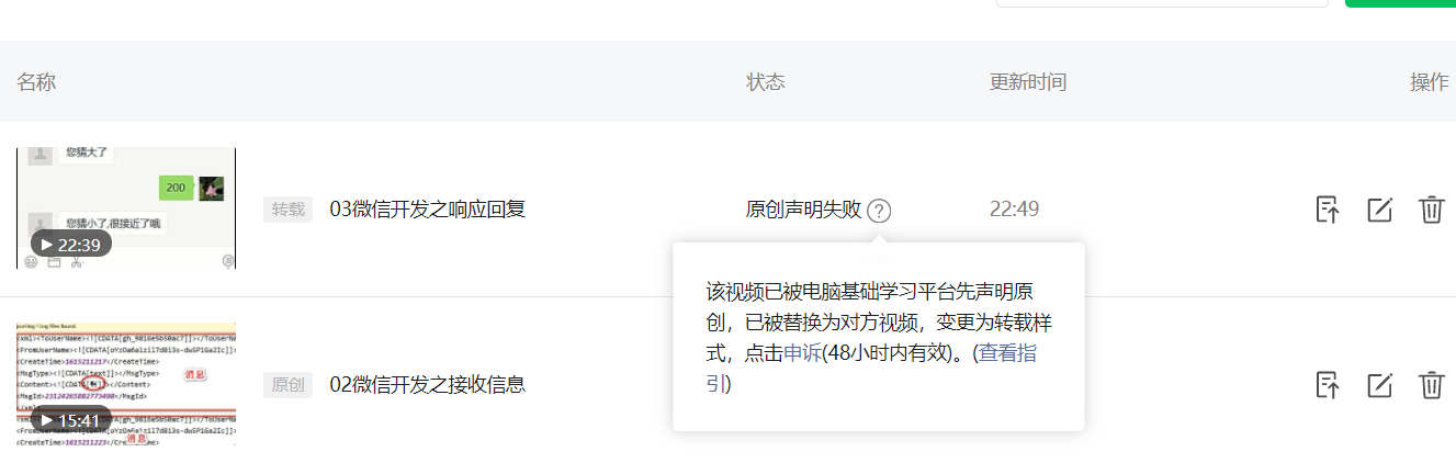 最近录制微信开发相关的教程,在微信公众号发布,但是每次上传自己录制并转换成mp4是视频后上传到平台就是审核失败,两个毫无相关的视频居然能联系到一起?说我侵权别人的视频,还强制播放别人的视频,视频这个算法有bug!!!望修复!!!。
