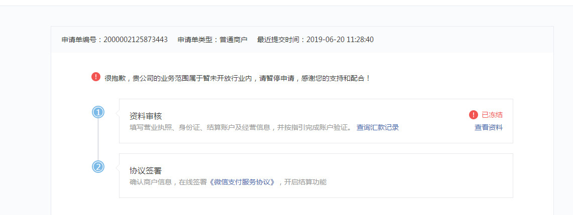请问一下这个是什么意思?之前也有客户是经营农产品的,已经通过了,现在这个客户的是销售土鸡、土鸡蛋类的,资料审核已冻结是???????? “很抱歉,贵公司的业务范围属于暂未开放行业内,请暂停申请,感谢您的支持和配合!”