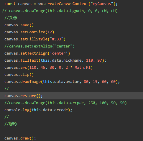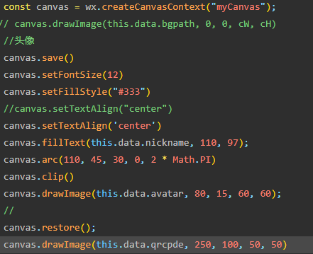 使用canvas画图时 我先用clip+drawImage方法画出用户的头像,然后通过restore恢复,但是再次调用drawImage方法时,会导致之前画的东西都消失了。画出来的结果是,但是再次调用drawImage方法想把二维码画上去时就什么都没有了,