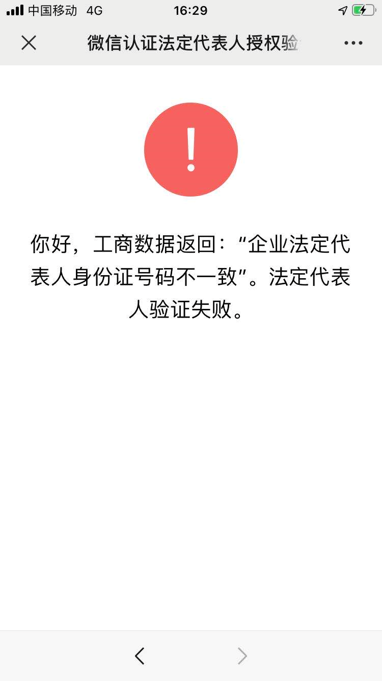 你好,工商数据返回:“企业法定代表人身份证号码不一致”。法定代表人验证失败。请刷新重试