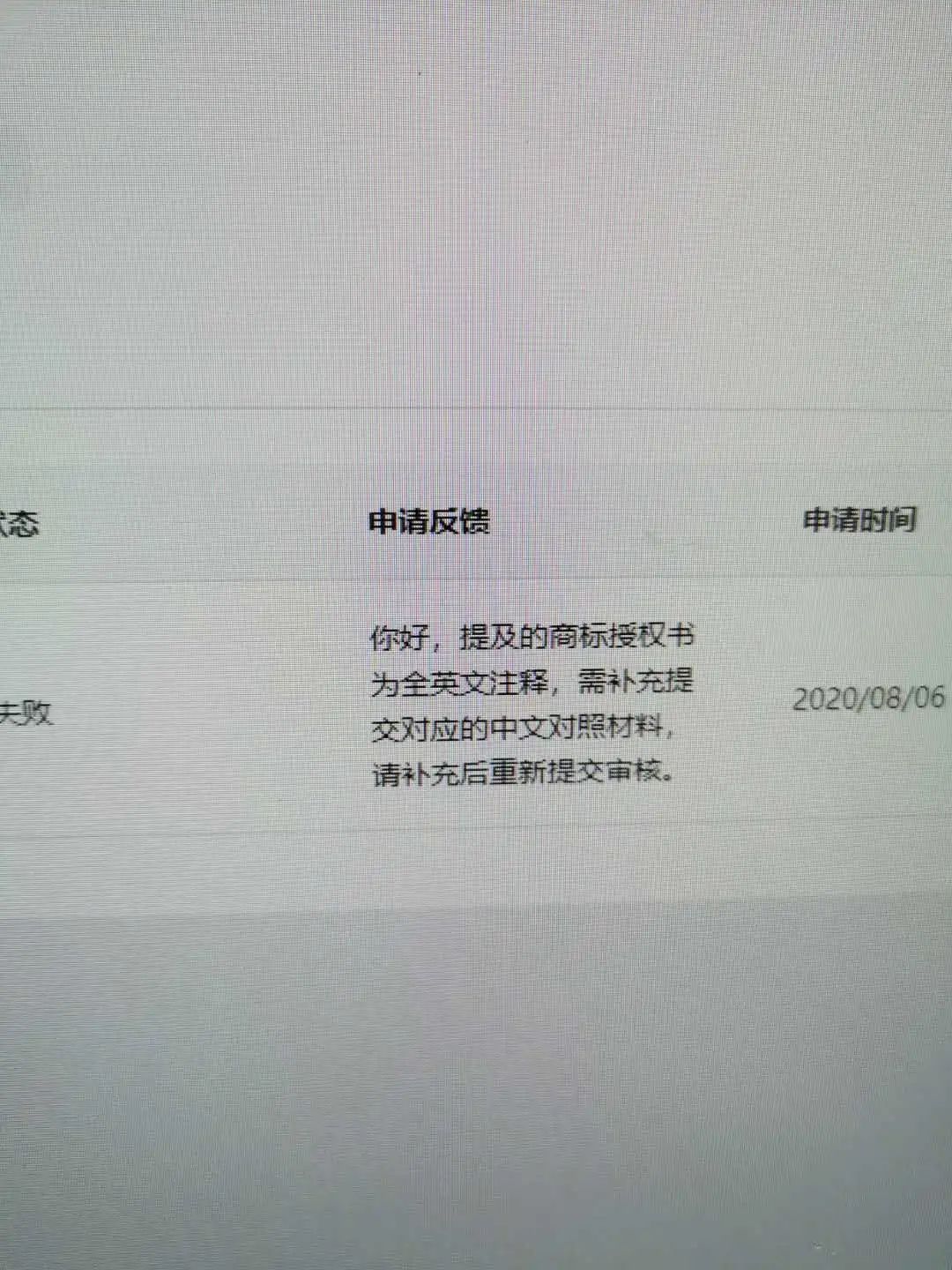 我上传了我代理的品牌授权书,目前只有英文版,审核提示失败:“需补充提交对应的中文对照材料,请补充后重新提交审核”