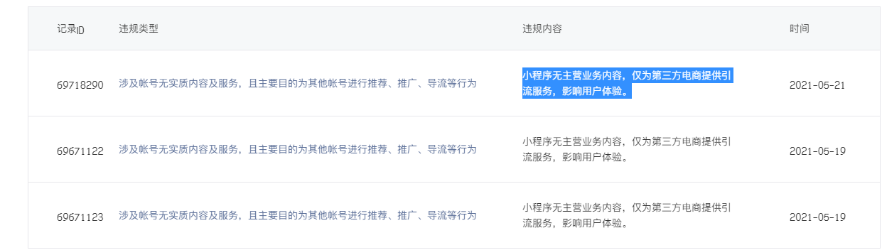 我们是做外卖美食推荐平台,我们和商家签订合约(可提供原件)用户通过我们去商家下单消费(商家的店铺小程序),周时可以领取优惠券去商家店铺下单消费,我们有完整主营业务,并不导流平台,全部用户在微信的小程序生态中完成,怎么算我们是个导流平台呢。并且一天给我们扣了60分,也没有看到任何消费通知和申诉入口,望仔细核实我们的产品及逻辑给予扣分取消。
