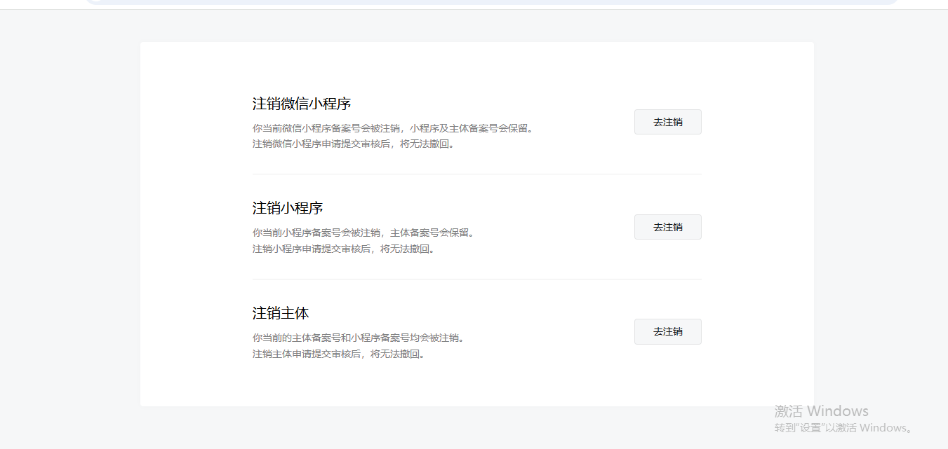 因注销是不可逆转的操作,建议请自行确认注销需求,避免造成不必要的损失,注销区别请参考:https://developers.weixin.qq.com/miniprogram/product/record/record_faq.html#%E5%8D%81%E5%9B%9B%E3%80%81%E6%B3%A8%E9%94%80%E5%A4%87%E6%A1%88%E7%9B%B8%E5%85%B3