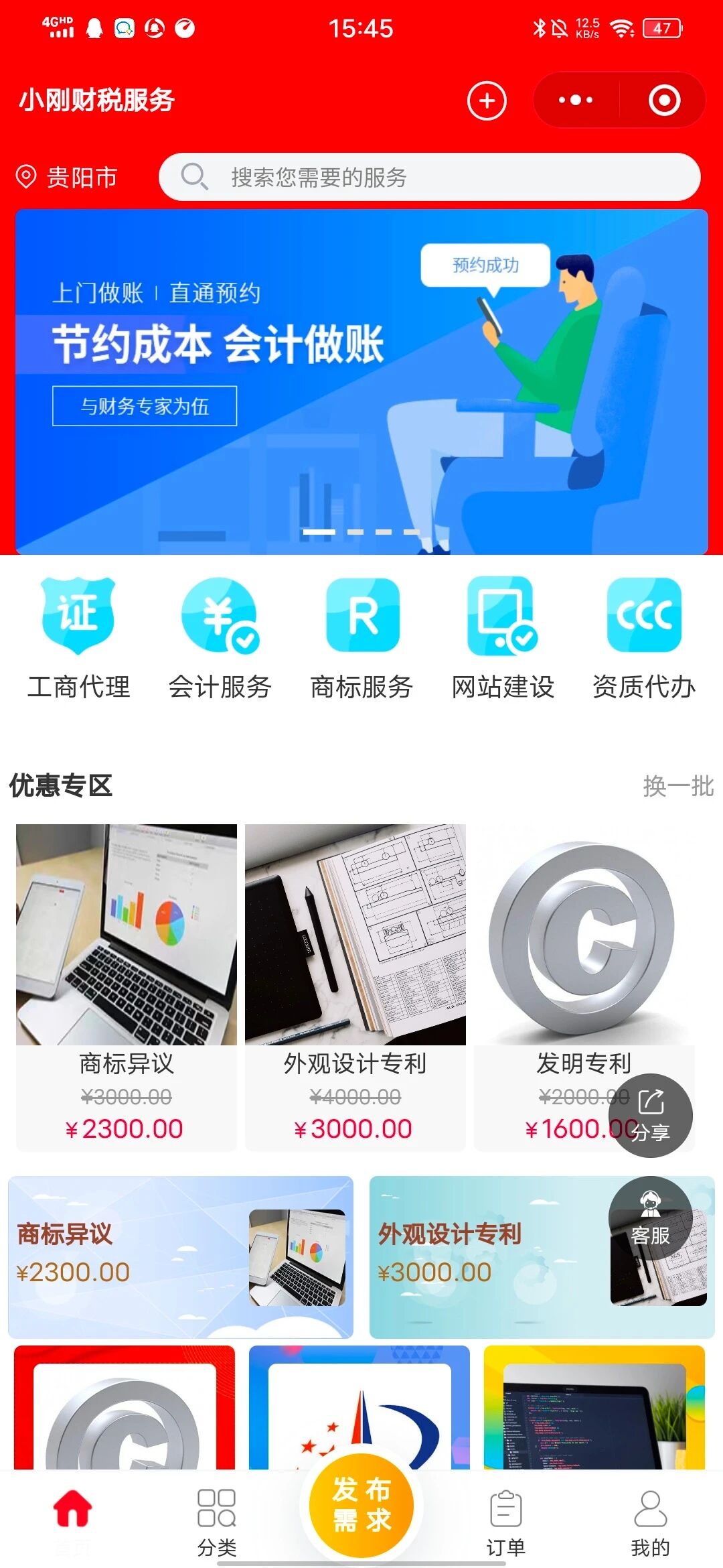 1.我的小程序是工商代办,代理记账等上门服务,类目是:生活服务 > 跑腿,商业服务 > 一般财务服务,商业服务 > 软件/建站/技术开发商家自营 > 家用电器