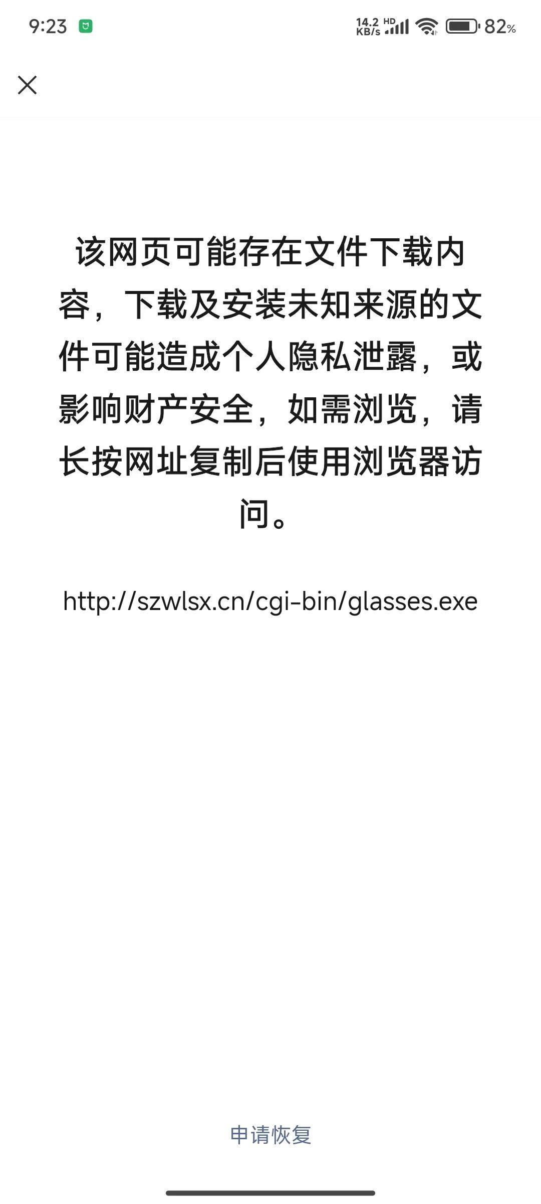 http://www.szwlsx.cn/cgi-bin/glasses_scnctpyyj_zt3.exe出现提示:该网页可能存在文件下载内容,下载及安装未知来源的文件可能造成个人隐私泄露,或影响财产安全,如需浏览,请长按网址复制后使用浏览器访问。该网页是提供给客户查询资料用的,不存在文件下载内容。