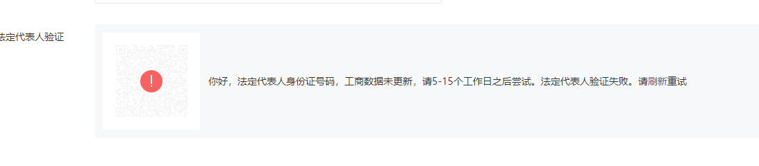 着急处理:微信认证你好,法定代表人身份证号码,工商数据未更新,请5-15个工作日之后尝试,