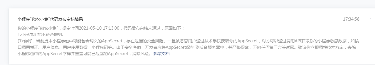 一直审核不通过 请您 告诉我 到底哪里出问题了 全部代码看过了 没有 AppSecret 暴露