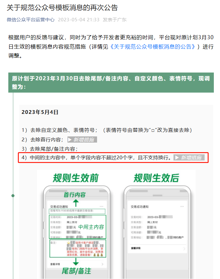 一会改一个样,前面去头尾还算是有提前通知,后面限制换行和字数,什么都没有说就改。。。也不提前通知,现在发关于模板消息的新帖子还被屏蔽了。本来模板消息限制就大,很多补充项都不够,只能靠换行来补充,你这突然给删掉,我们系统25条模板消息都用满了,你是要我给你再提交25条模板消息的申请?真心累。。。