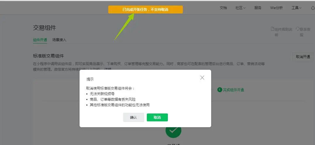 小程序不小心开通了“标准版交易组件”,现在想取消,系统提示已经开张不能取消,请问怎么才能关闭再切到“自定义版交易组件”?总得有个解决方案吧?