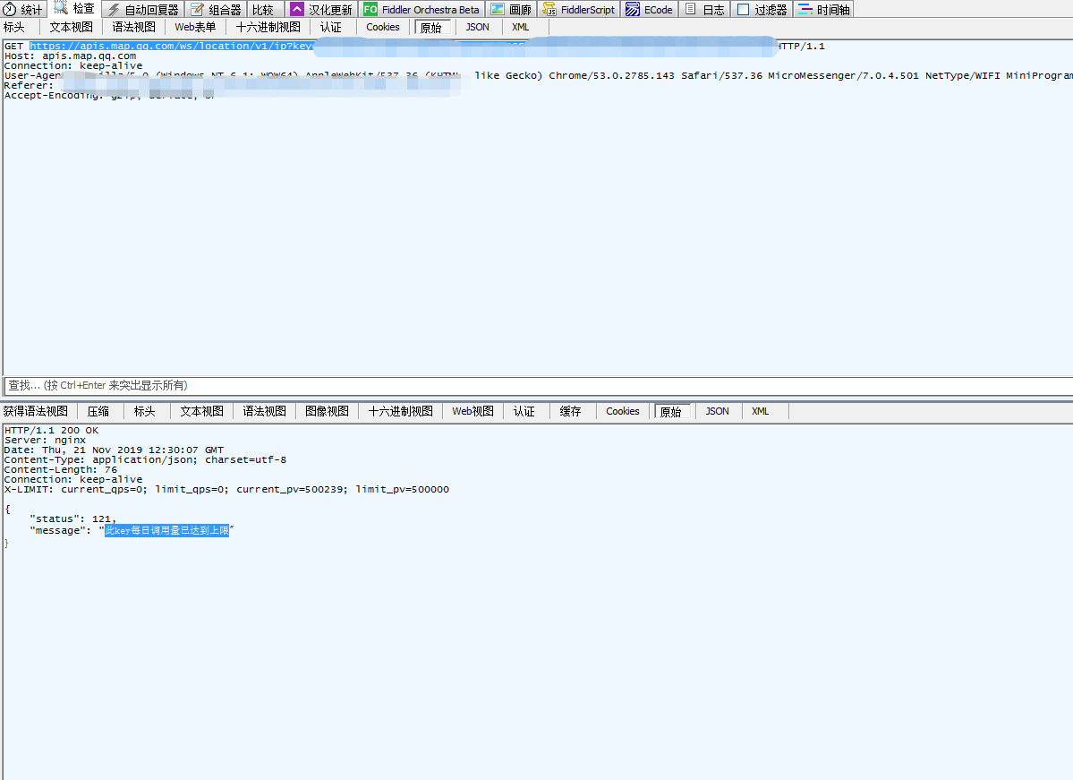 不断分析发现是部分用户的gps是关闭状态,所以无法通过gps获取位置坐标.这时候微信会通过ip来获取位置信息.经过抓包发现问题出现在腾讯地图的接口配额.