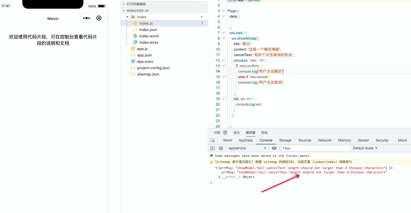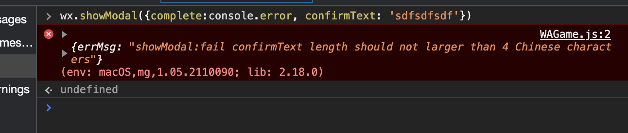 文档写着 showModal 确认或取消文字不能大于4个字,有时候忘记了,这时候应该报错或者警告吧,开发工具一点反应都没有,还以为是我条件判断出错了(笑哭),搞半天才反应过来是这个按钮有文字字数限制。