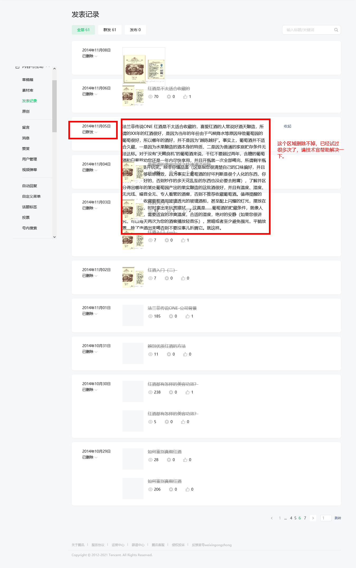 公众号ID gh_8b7c3400b625 历史文章 2018年4月26日、2018年12月4日、2018年12月6日、2019年2月21日 这四篇已发送文字内容公众号后台无法删除 没有删除按钮 请官方协助删除