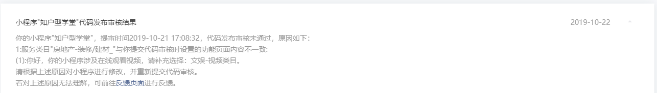 你好,经核实,贵方小程序涉及在线观看视频,需补充选择文娱-视频类目或可尝试接入文娱-视频插件
