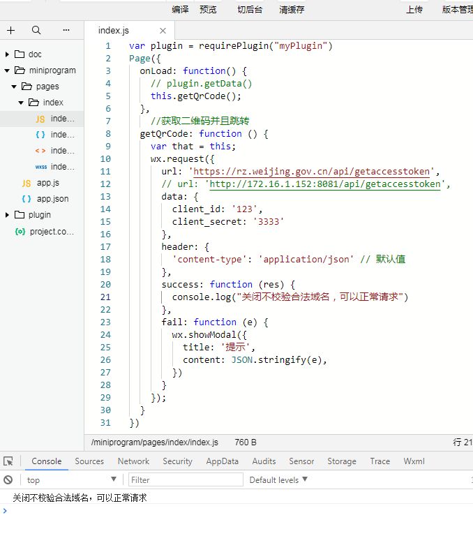 后台设置了合法域名,真机调试的时候关闭调试模式,一直提示,域名不在合法域名列表中,开发工具中关闭不校验合法域名试调是正常的。