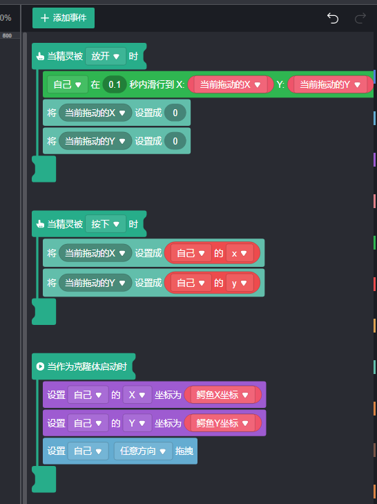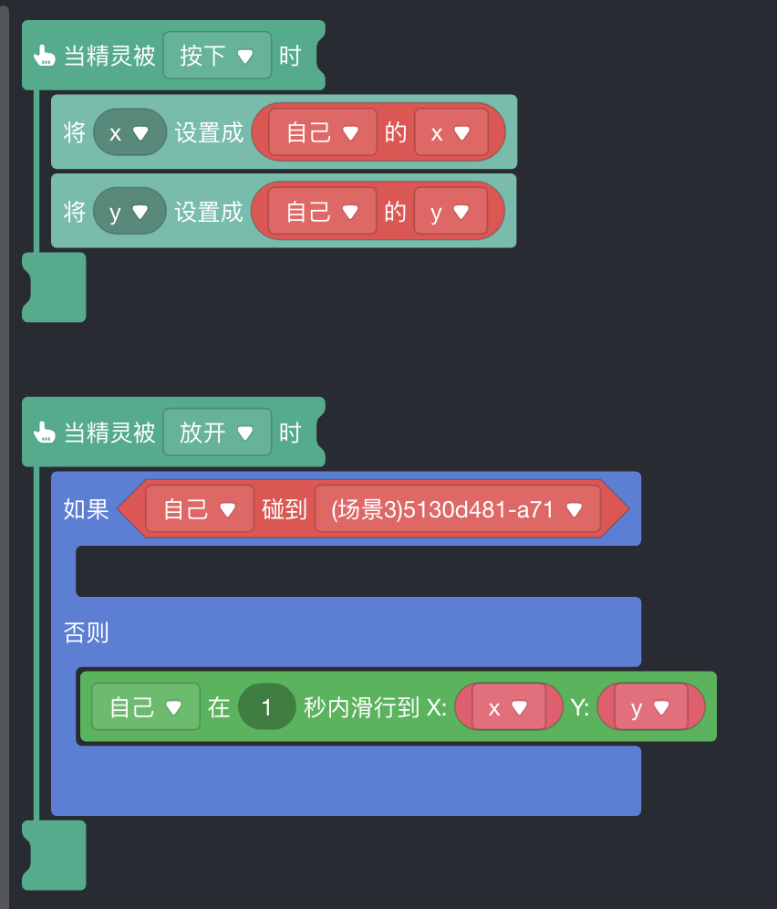 推拽完成后根据位置不同或与其他精灵的相交情况分别做处理,比如未到达指定位置松开推拽是精灵弹回拖拽前坐标。