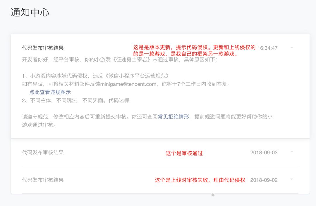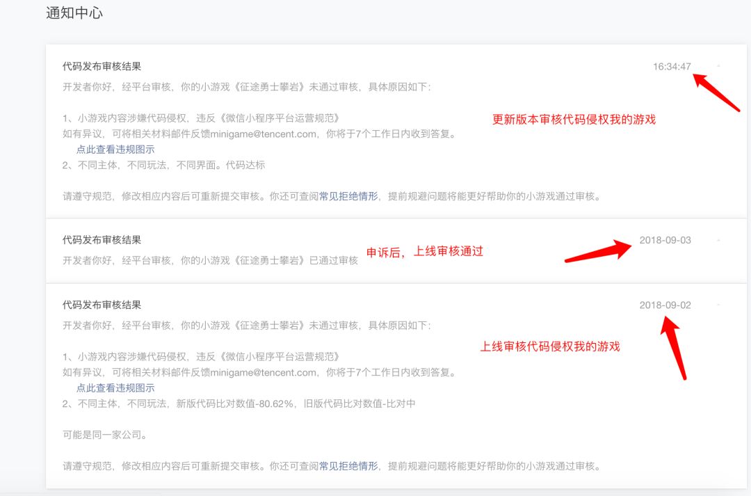 你好,小游戏征途勇士攀岩,昨天上线时涉嫌代码侵权自己的另一个游戏,然后发官方邮件申诉后已上线。