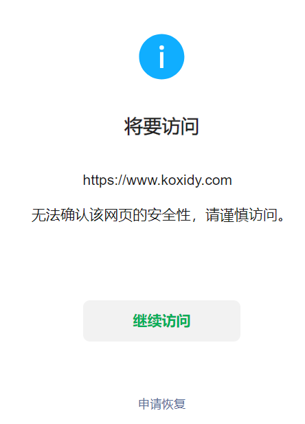 公众号里菜单加了链接“https://www.koxidy.com/”,可是打开提示“无法确认该网页的安全性,请谨慎访问”,经排查网站不存在任何违法违规信息,麻烦解除下拦截,谢谢!