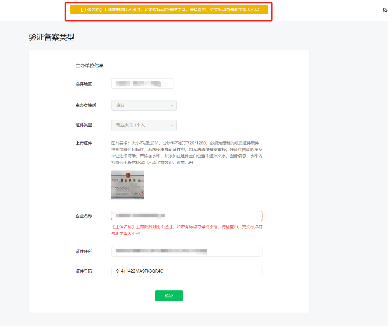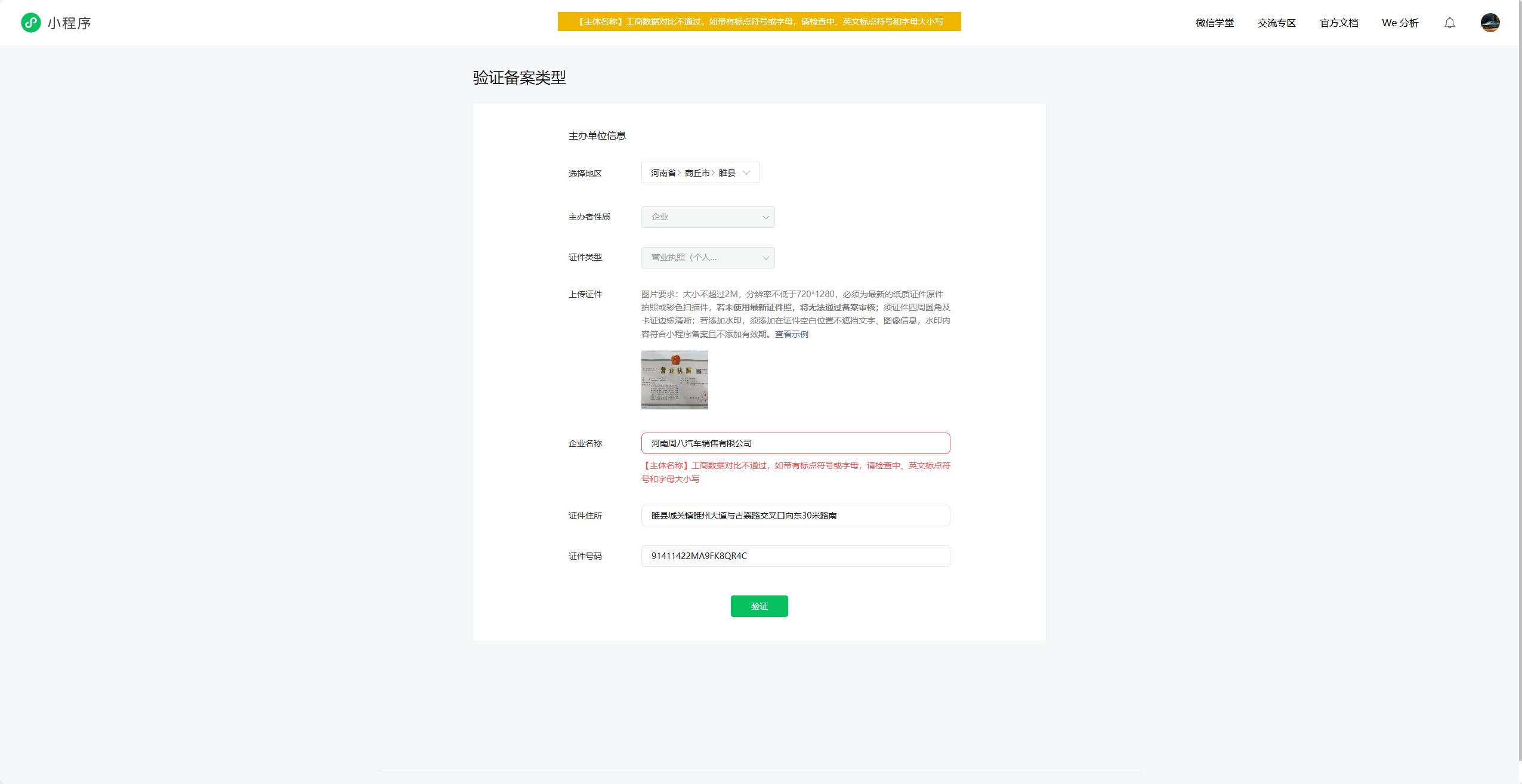 你好,请提供完整报错界面截图和营业执照以便核实。