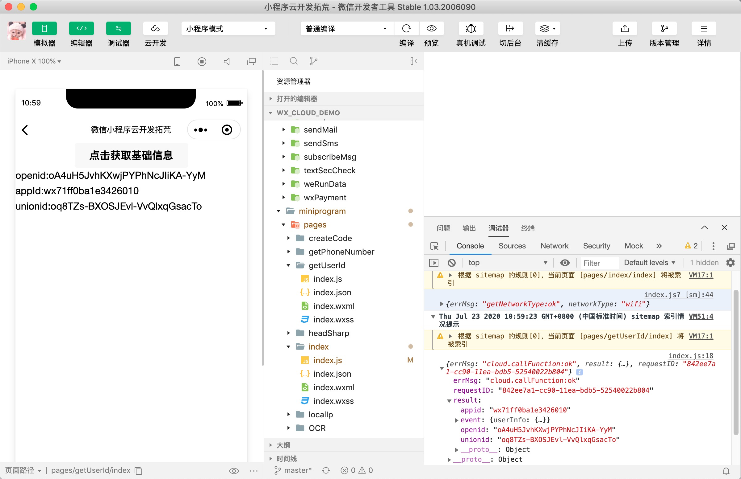 然后,通过wx.login拿到code给后端解密拿到openId、unionid等,当然你也可以使用云开发,前端操作拿到unionid