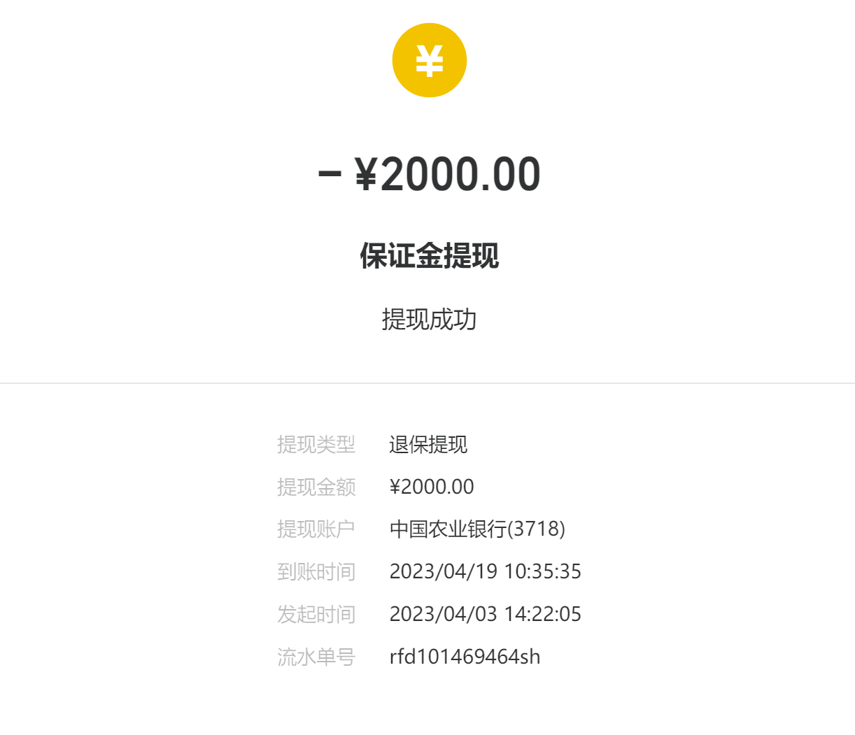 4月1号申请的退保证金,4月19号看后台显示已经提示成功,但是我的银行账户根本查询不到,转账记录,也根本没有收到这个钱