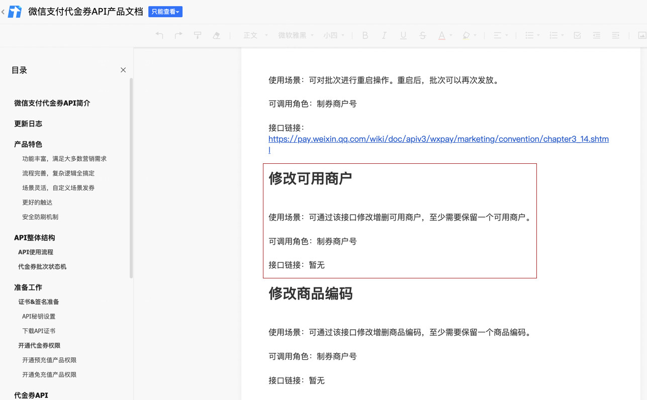 2、前面的文档说,有修改可用商户的接口,但是到了这个文档里,接口链接又是暂无。