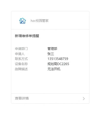 【使用场景】校园学生申请故障报修(如电风扇故障、空调故障、饮水机故障、电梯故障等),为了及时响应,通过小程序消息订阅通知到维修工