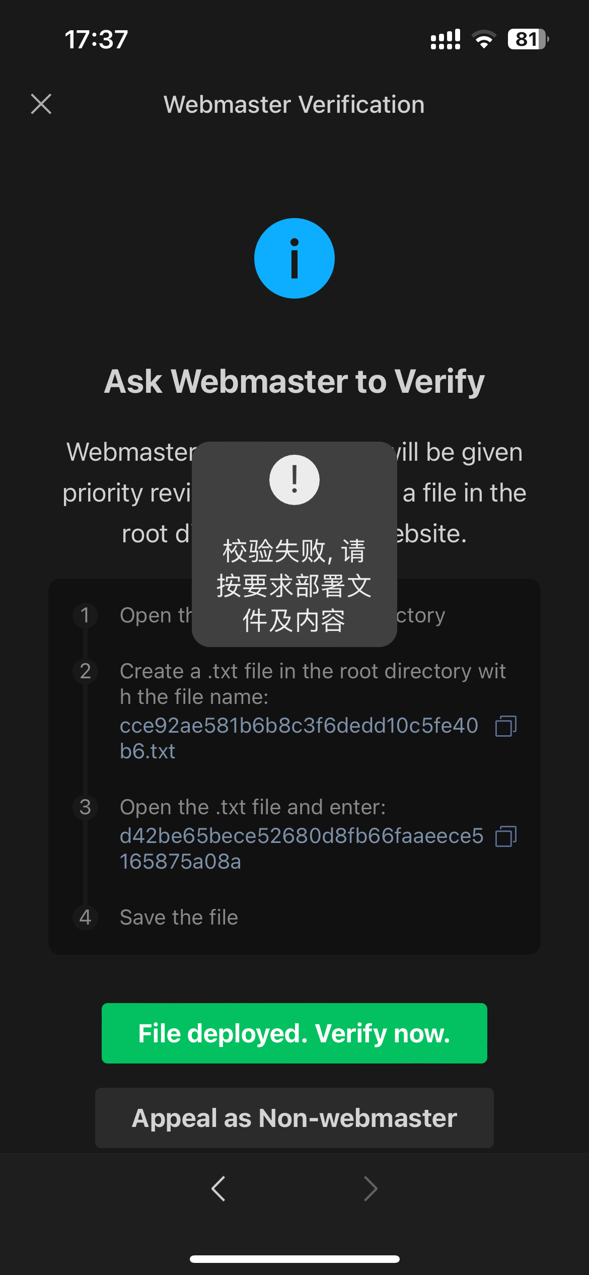 微信上识别图片二维码会提示已被封禁,申诉流程也无法提交,配置了校验文件,但提交会报错”校验失败...“;