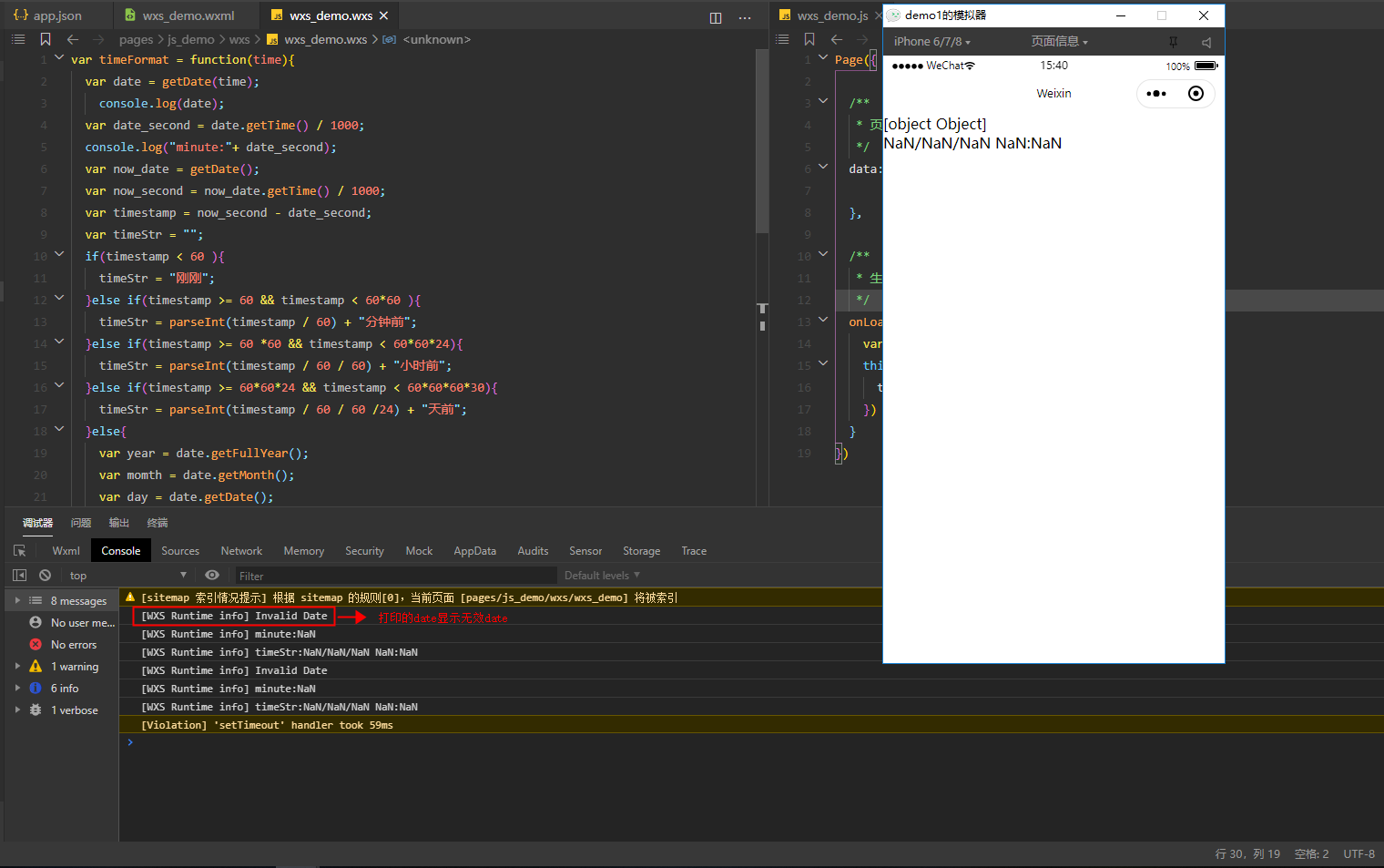 如题,今天学习wxs文件的使用,在写demo的时候出现了一个问题,在page页面的onLoad函数中定义了一个new Date(2020,11,10,14,40,50),并且使用this.setData函数更新数据,通过wxs文件接收后处理后返回给视图层,但是在控制台显示传入的数据是Invalid Date,并且后面的数据打印出来全部为NaN,想请各位大佬们给我找找问题出在哪,下面是代码和截图: