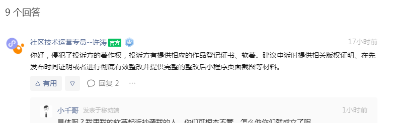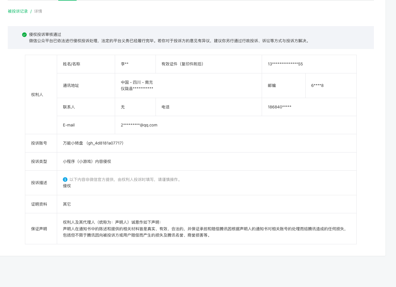 建议,小程序应该像公众号文章侵权一样,能够查看到对方提供的材料,是文字侵权,还是图片侵权,投诉方提交了什么材料,明白了当,公众号平台然后给侵权方质证,提交材料,才会下架此文章。解决不了,由法院解决。
