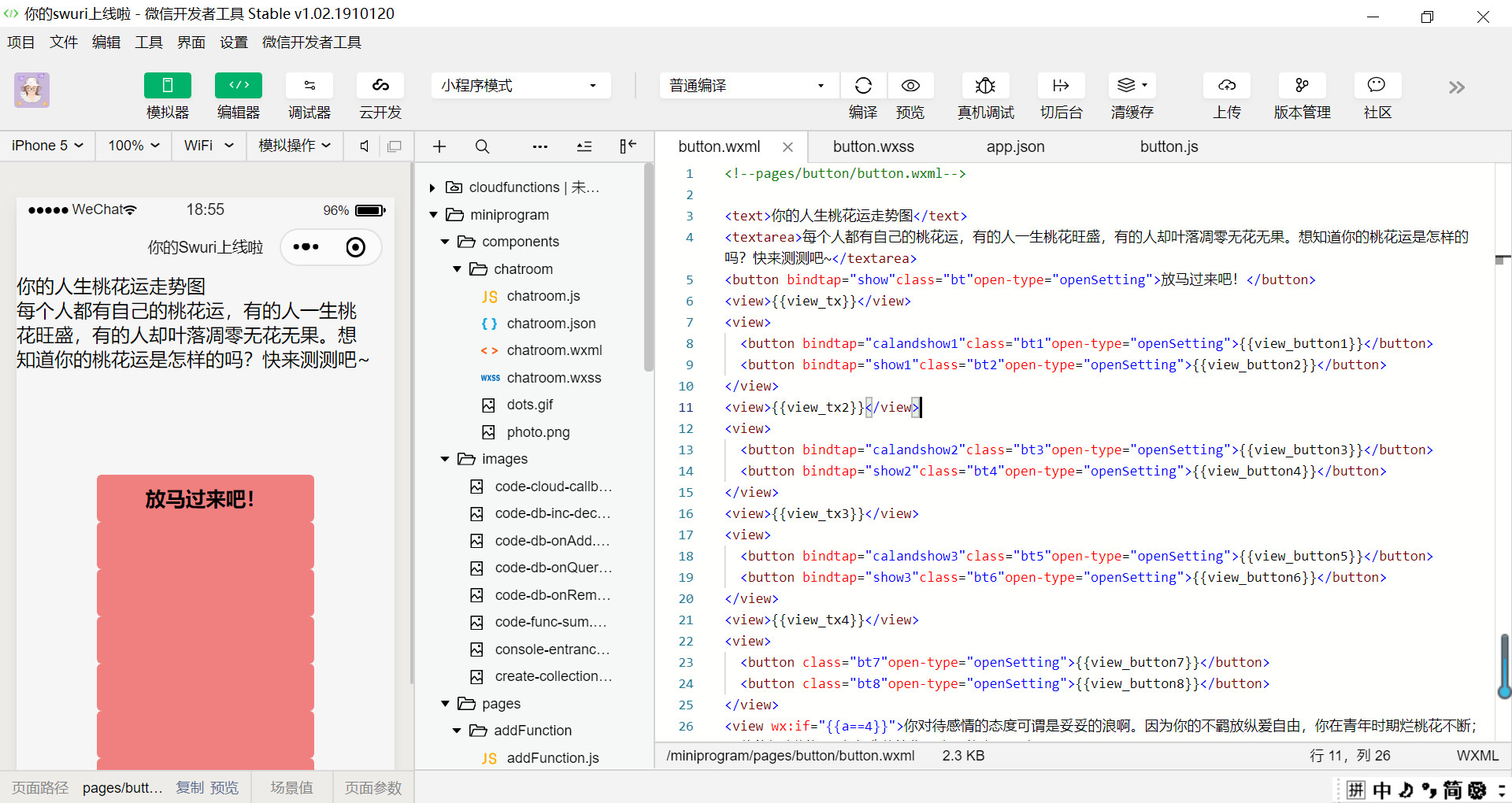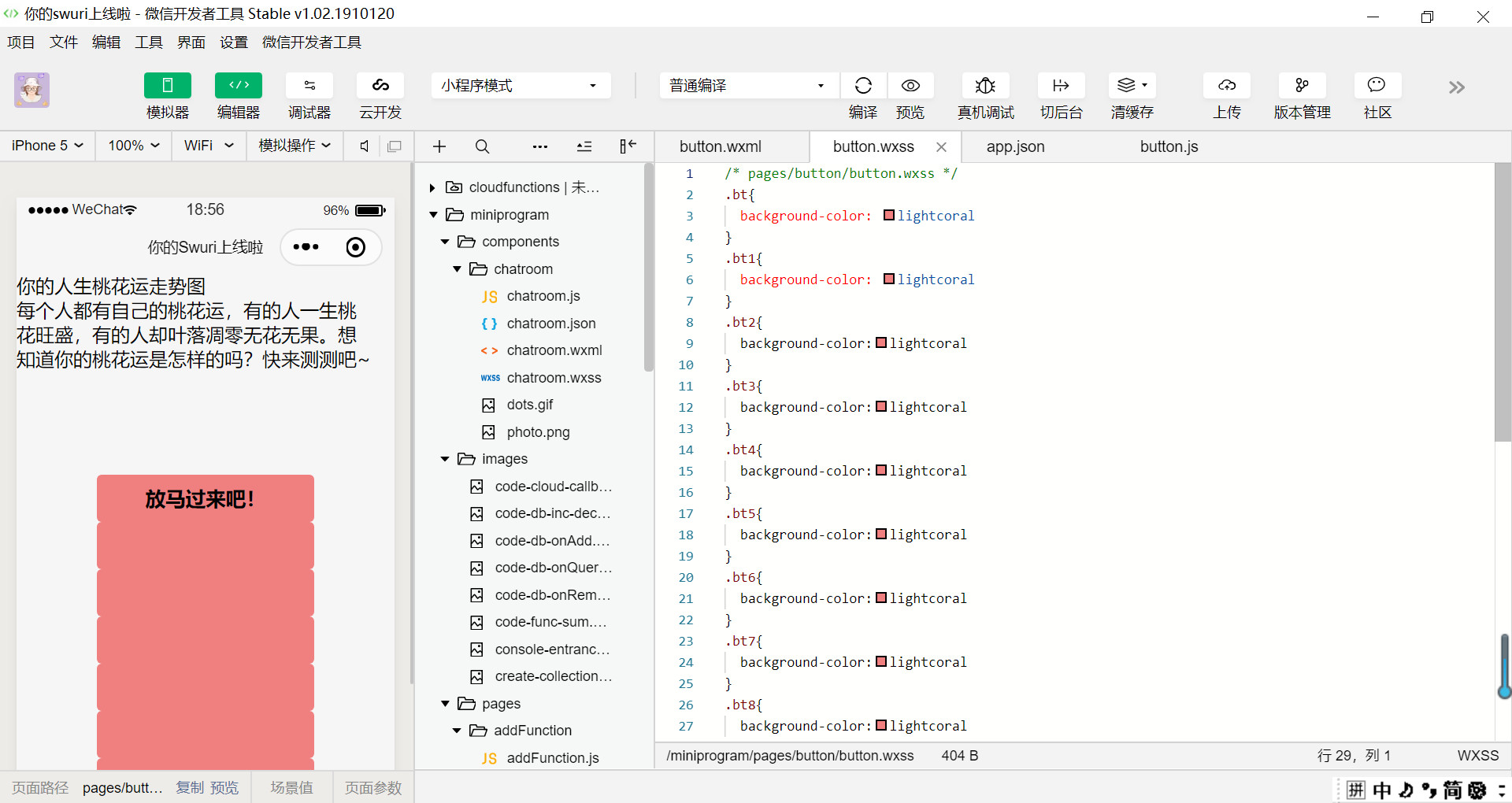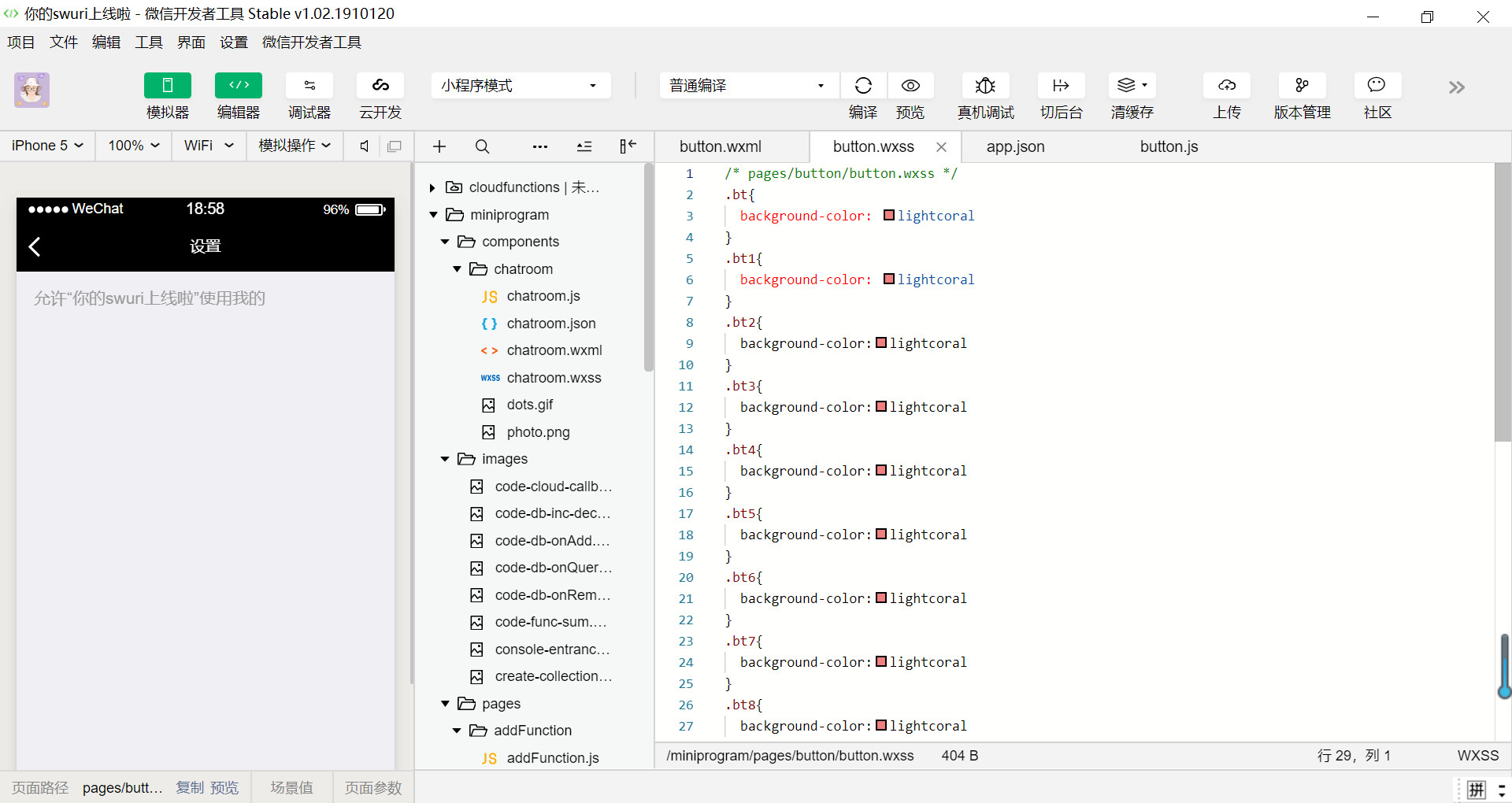 我的wxml代码我的wxss代码然后按钮就变成了左图的样子 点击按钮,会弹出如下页面:这是怎么回事?