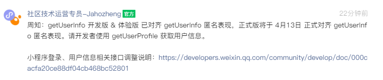 周知:getUserInfo 开发版 & 体验版 已对齐 getUserInfo 匿名表现,正式版将于 4月13日 正式对齐 getUserInfo 匿名表现。请开发者使用 getUserProfile 获取用户信息。