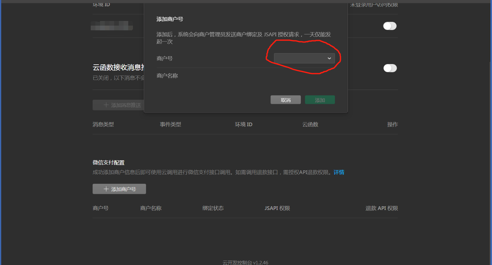 我已经在微信公众平台绑定了相关商户号,但在云开发控制台中的下拉菜单依然为空,请问这是什么情况?求大神解答