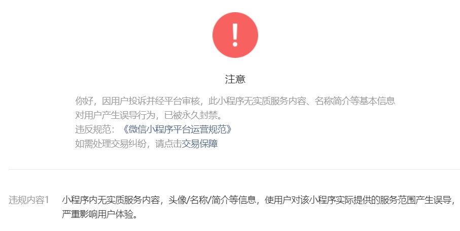 经核实,小程序无实质服务内容,且头像/名称/简介等信息使用户对该小程序实际提供的服务范围产生误导,严重影响用户体验。请自觉遵守国家相关法律法规,不从事违法或违反《微信小程序平台运营规范》及相关规则的内容和行为,谢谢。