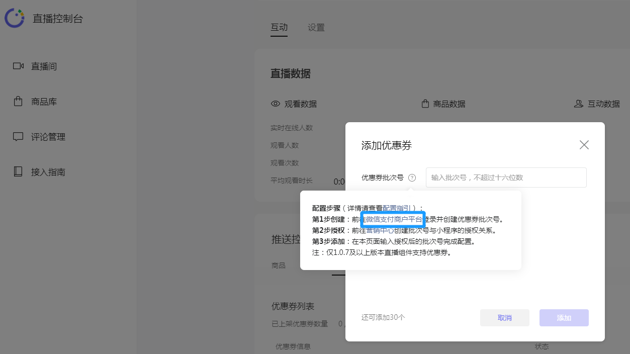 2、根据直播控制台的指引,想要添加“优惠券批次号”,点击后跳到了【帐户中心】,并没跳转到创建优惠券批次号功能,如何解决?