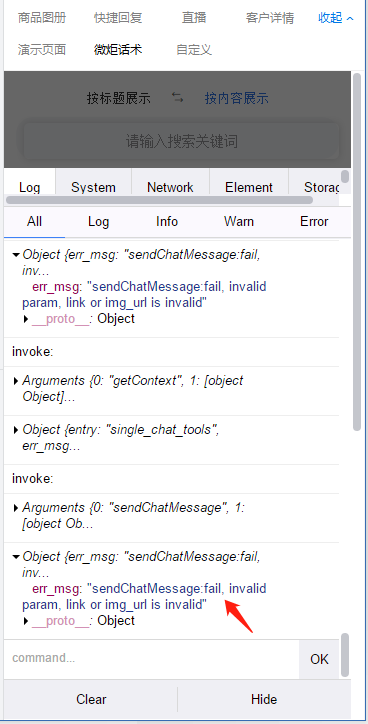 sendMessage(item) { const that = this; this.$wx.invoke("getContext", {}, function (res) { if (res.err_msg == "getContext:ok") { const entry = res.entry; //返回进入H5页面的入口类型,目前有normal、contact_profile、single_chat_tools、group_chat_tools if (entry == "single_chat_tools" || entry == "group_chat_tools ") { switch (item.type) { case "文本": that.$wx.invoke( "sendChatMessage", { msgtype: "text", //消息类型,必填 text: { content: item.content, //文本内容 }, }, function (res) { if (res.err_msg == "sendChatMessage:ok") { //发送成功 } else { this.$toast("发送失败"); } } ); break; case "图片": that.$wx.invoke( "sendChatMessage", { msgtype: "image", //消息类型,必填 image: { mediaid: item.media_id, //图片的素材id }, }, function (res) { if (res.err_msg == "sendChatMessage:ok") { //发送成功 } else { this.$toast("发送失败"); } } ); break; case "视频": that.$wx.invoke( "sendChatMessage", { msgtype: "video", //消息类型,必填 video: { mediaid: item.media_id, //图片的素材id }, }, function (res) { if (res.err_msg == "sendChatMessage:ok") { //发送成功 } else { this.$toast("发送失败"); } } ); break; case "文件": that.$wx.invoke( "sendChatMessage", { msgtype: "file", //消息类型,必填 file: { mediaid: item.media_id, //图片的素材id }, }, function (res) { if (res.err_msg == "sendChatMessage:ok") { //发送成功 } else { this.$toast("发送失败"); } } ); break; case "链接": console.log("item", item); that.$wx.invoke( "sendChatMessage", { msgtype: "news", //消息类型,必填 news: { link: item.link_url, //H5消息页面url 必填 title: item.link_title, //H5消息标题 desc: item.describe, //H5消息摘要 imgUrl: item.url, //H5消息封面图片URL }, }, function (res) { if (res.err_msg == "sendChatMessage:ok") { //发送成功 } else { this.$toast("发送失败"); } } ); break; default: break; } } } else { //错误处理 } }); },看错误提示是 分享链接或者图片链接错误?