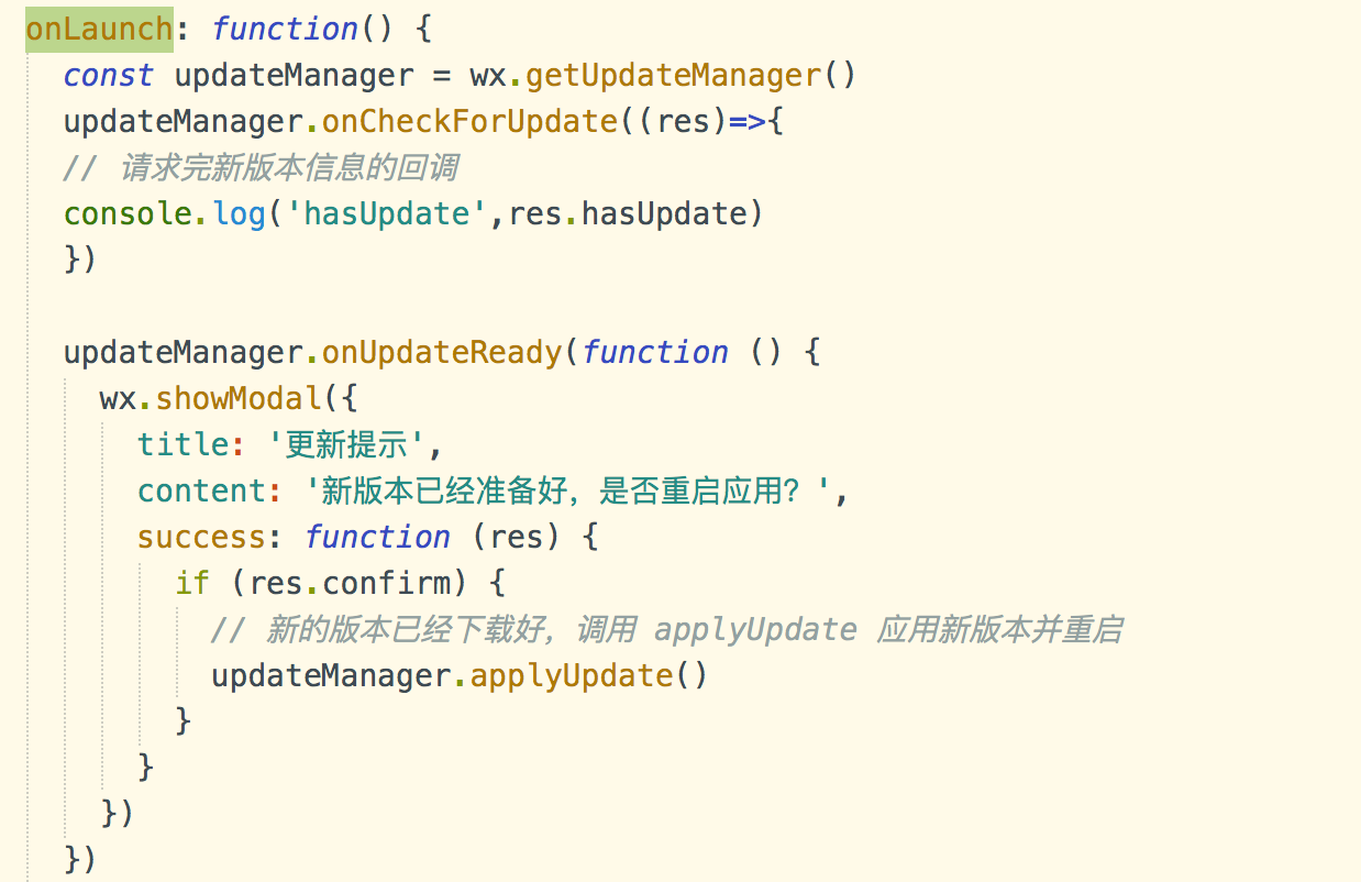 App({ onShow: function (e) { const updateManager = wx.getUpdateManager(); updateManager.onCheckForUpdate(function (res) { if (res.hasUpdate) { wx.showLoading({ mask: true, title: '应用更新中', }) } }) updateManager.onUpdateReady(function () { wx.hideLoading({ success: (res) => { updateManager.applyUpdate() } }) }) updateManager.onUpdateFailed(function () { wx.showToast({ title: '小程序加载失败', icon: 'error', duration: 2000 }) }) }, })