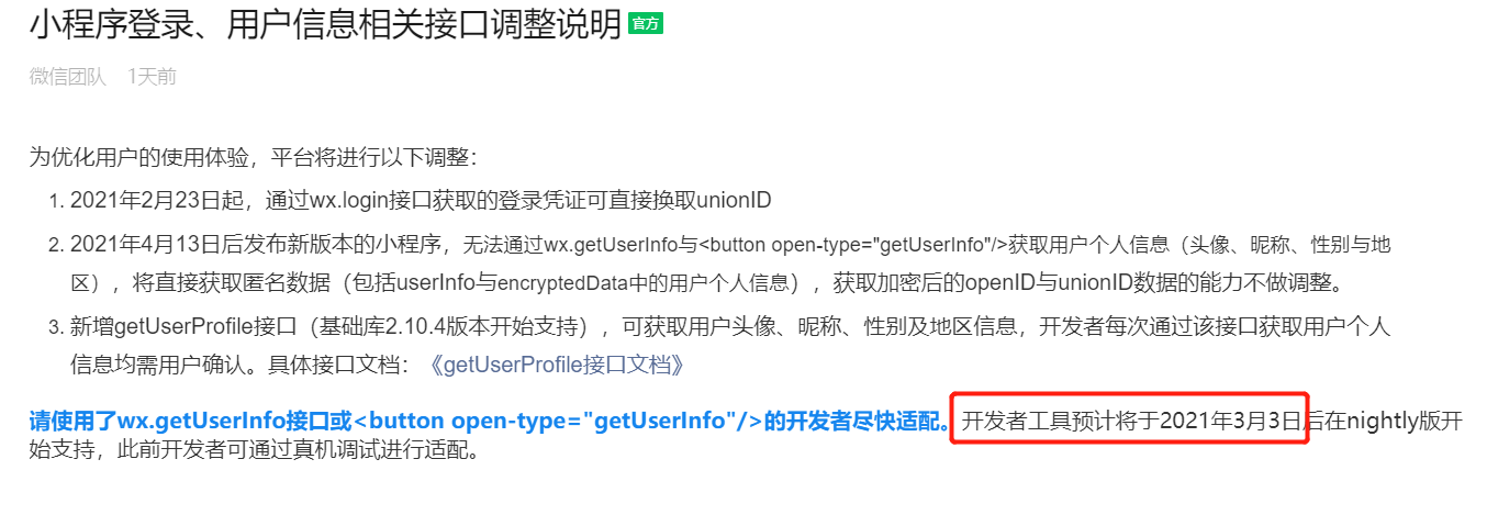wx.canIUse('wx.getUserProfile') => wx.canIUse('getUserProfile')我这边试过了也是wx.canIUse('wx.getUserProfile')为false,但是可以使用注意的是新的接口wx.getUserProfile,只能使用catchtap或者bindtap进行调用(ps:可以再wx.getUserProfile中使用),并不能再onload、onshow等位置直接调用
