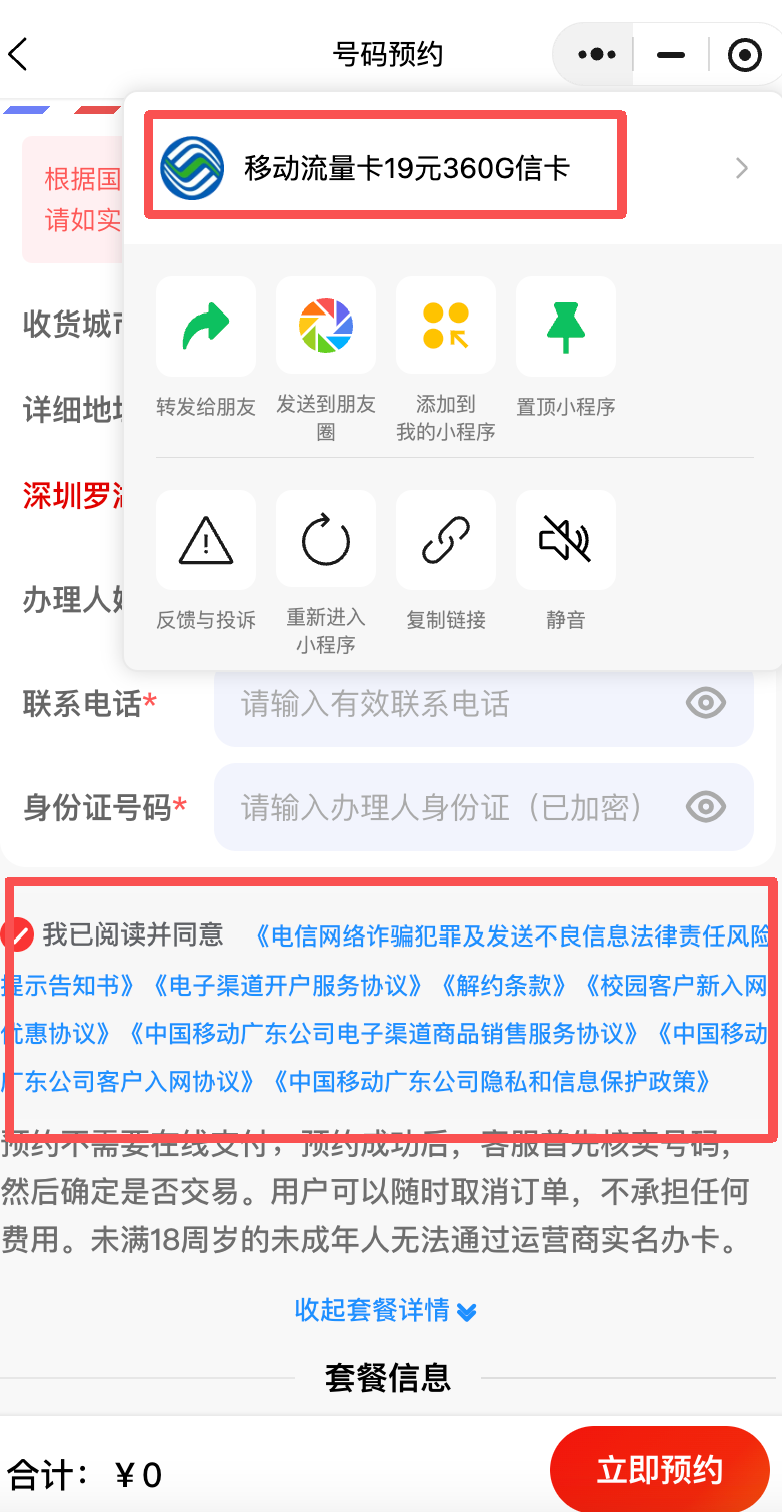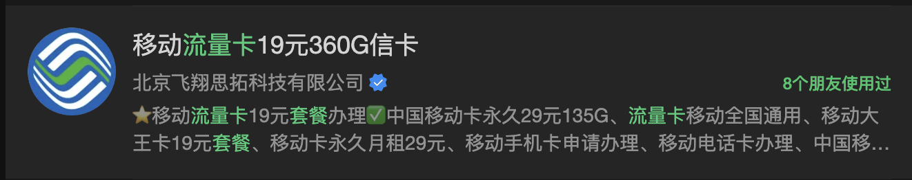 小程序名称:移动流量卡19元360G信卡(主体:北京飞翔思拓科技有限公司)