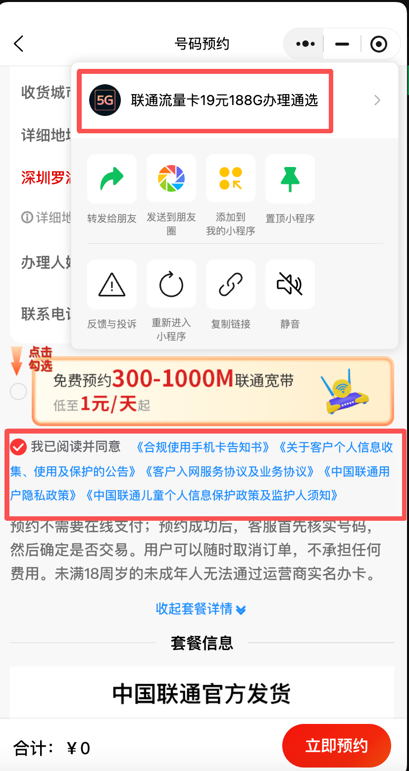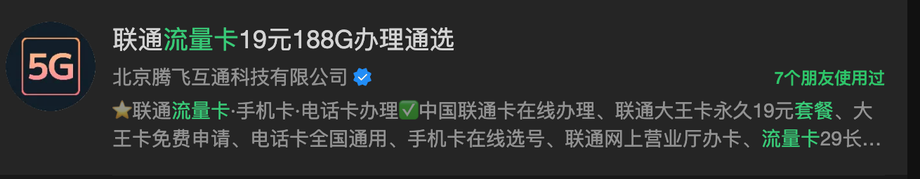 小程序名称:联通流量卡19元188G办理通选(主体:北京腾飞互通科技有限公司)