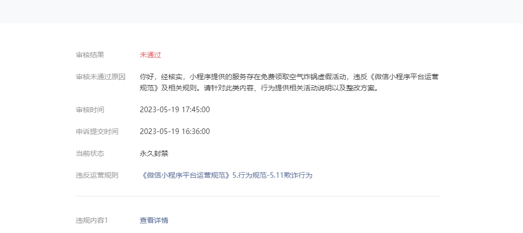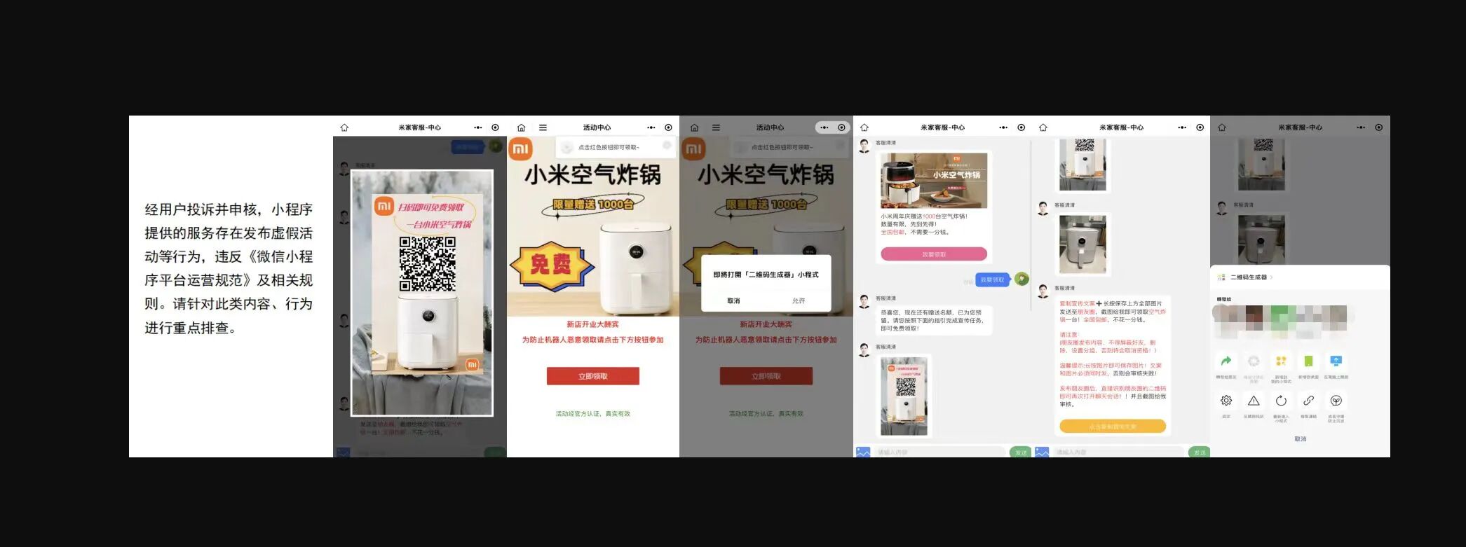 我司是“二维码生成器”,二维码被人恶意贴到“米家”的活动上,截图显示的都是米家的相关信息,第一张图中解开是微信官方域名,并且跳转的一个叫牛二的小程序,第三张图中“即将打开【二维码生成器】小程式”,都还有错别字,最后一张图中我司小程序都没有这个内容,就被判定为“二维码生成器”小程序 提供的服务涉嫌免费领取空气炸锅虚假活动,违反《微信小程序平台运营规范》及相关规则。被永久封禁,申诉很多次了都不通过。