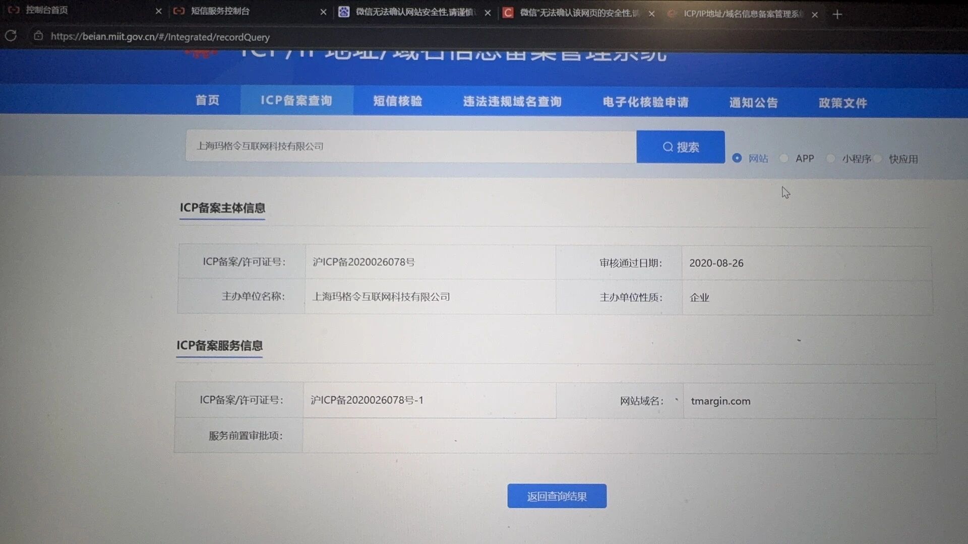 我司开发的H5外链:https://x.tmargin.com/sensai/ 仅为客户公司用作活动预约验证,并领取预约礼品核销 没有任何违规内容,域名也是通过ICP备案的 备案号:沪ICP备2020026078号 备案公司主体:上海玛格令互联网科技有限公司 能有什么办法吗?或者客服电话?