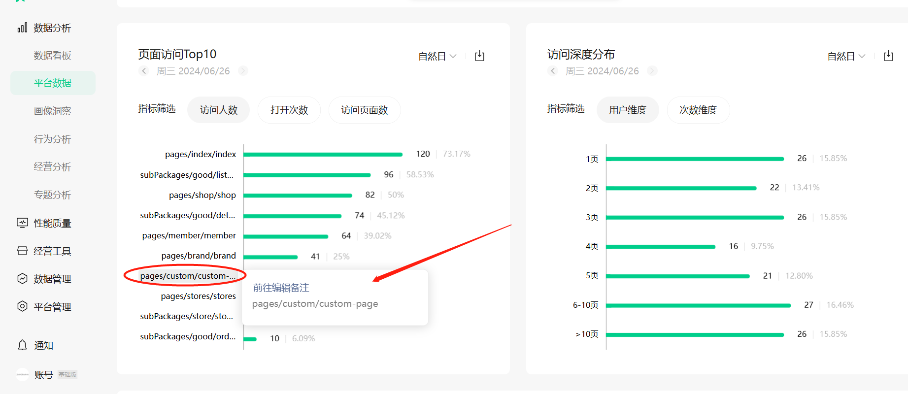 在平台数据的页面分析中,下拉到“页面访问TOP10”,其中的 pages/custom/custom-page 对应着小程序的自定义页面。但是只能看到一个总数,无法看到详细到不同的自定义页面的数据,是否有办法能看到更详细的数据?(包括 流量,以及自定义页内包含的产品跳转销量)?