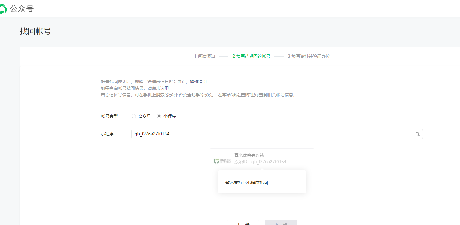 我又去找回小程序账密,打算改名字,结果提示,此类小程序暂时无法找回。
